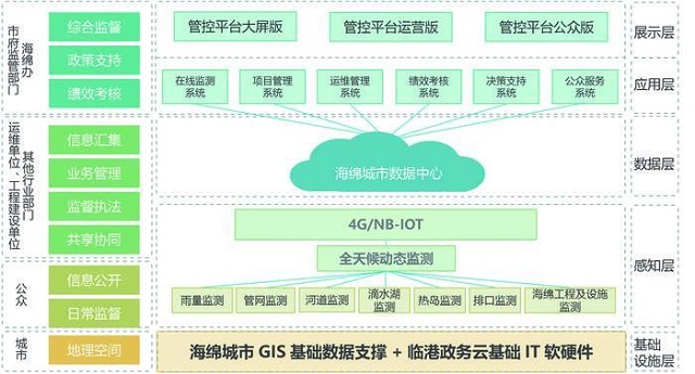 臨港海綿城市智慧管控平臺,集硬件監(jiān)測設備和軟件系統(tǒng)為一身,包括集成站、岸邊站、管網流量計、雨量計、在線監(jiān)測系統(tǒng)、項目管理系統(tǒng)、運維管理系統(tǒng)、績效考核系統(tǒng)、決策支持系統(tǒng)、公眾服務系統(tǒng)等。管控平臺在系統(tǒng)建設過程中融合“水彈性城市”理念,主要使用物聯(lián)網、大數據、云計算等新一代信息化技術,以云計算虛擬化平臺為基礎,以海綿城市數據中心為核心,結合GIS(地理信息系統(tǒng))+物聯(lián)感知網絡構建海綿城市智慧管控平臺,多角度全方位實時監(jiān)測海綿城市建設過程及運行情況,通過多源數據融合技術及數據分析技術,實現對海綿城市從規(guī)劃建設到運行管理的閉環(huán)精準管理,實現海綿城市各區(qū)域、各部門、各系統(tǒng)、各設施的高效聯(lián)動,讓海綿城市功能得到充分、長效的發(fā)揮。
