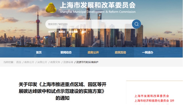 上海市推進重點區域、園區等開展碳達峰碳中和試點示范建設的實施方案
