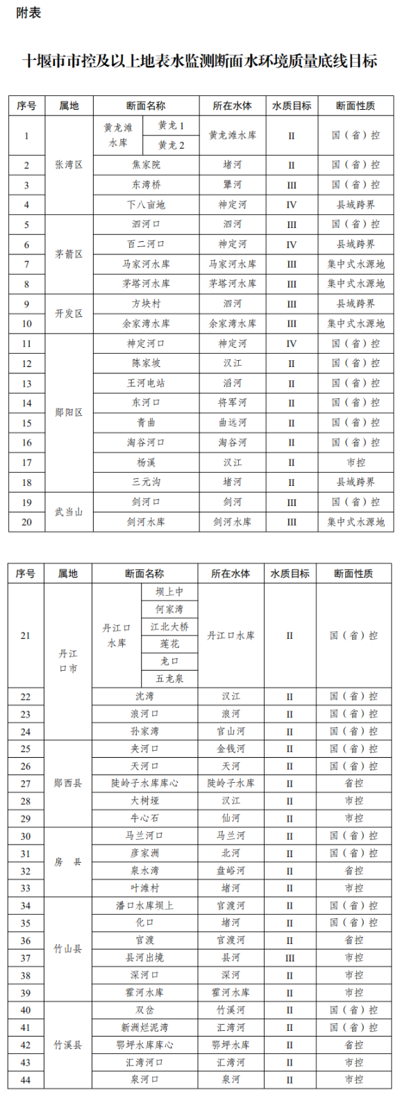 附表:十堰市市控及以上地表水監測斷面水環境質量底線目標
