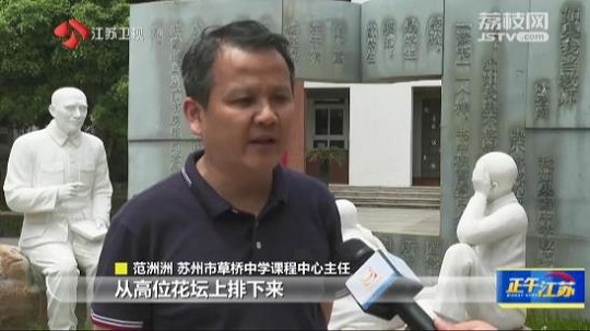 蘇州市草橋中學課程中心主任范洲洲:“通過雨水管道從高位花壇上排下來,一部分排到地下的管網(wǎng),還有一部分留在了罐子里,作為植物的灌溉需求。”