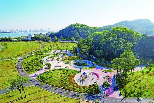 為修復山海生態廊道,設計基于場地東西側的文化資源(東側曾為輪渡渡口,渡口文化濃厚,西側有現代工業遺跡、媽祖廟等),通過生態、景觀、文化、活力四大策略,打造城市門戶、活力公園,保留和修復場地內的自然山體、古樹名木、坑塘濕地,破除硬化地面,對土壤、岸線進行生態修復,種植抗風、耐鹽堿鄉土樹種,豐富生物多樣性,形成一條通山達海、綠廊貫通的生態廊道。