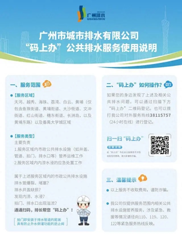 廣州水投排水公司公共排水服務(wù)“碼上辦”正式在公眾號開通服務(wù)窗口啦!只要是在排長服務(wù)區(qū)域內(nèi)的市政公共排水設(shè)施,無論是排水管爆裂、堵塞還是排水井蓋缺損,或者是出現(xiàn)內(nèi)澇、水浸,拍門、流水口污水溢流等情況都可以統(tǒng)統(tǒng)掃碼完成“一碼通辦”!