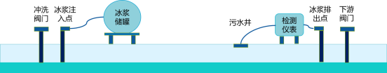 冰漿清洗技術是將冰漿加注進管道內,使冰漿在管道內形成一段柔軟的“冰活塞”,再利用市政管道上游水壓推動“冰活塞”向前移動,在移動時冰漿與管道內壁發生碰撞及摩擦,使管底沉積物與管壁附著物的穩定結構遭到破壞,從而剝離管壁并隨著冰漿一起向前移動直至排出管道,最終達到清洗管道的目的。