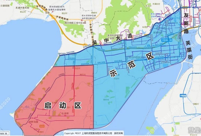 臨湖片區高品質供水啟動區位于吳中區西側,毗鄰太湖,北至東太湖路,南至大缺港,東至東山大道,西至環太湖路,總面積約54平方公里,共包含44個小區,12個行政村,目前服務人口數量約為10萬人。該片區飲用水主要由吳中新水廠供給,供水規模約2.5萬m3/天。