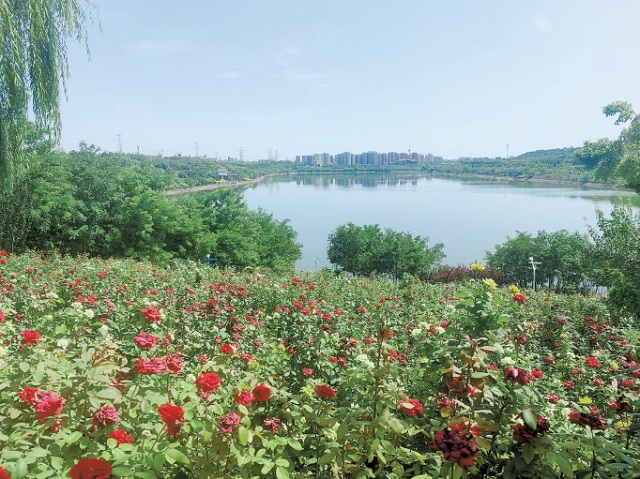 西郊雨洪調蓄工程阜石路砂石坑水面開闊,四周植被繁茂。
