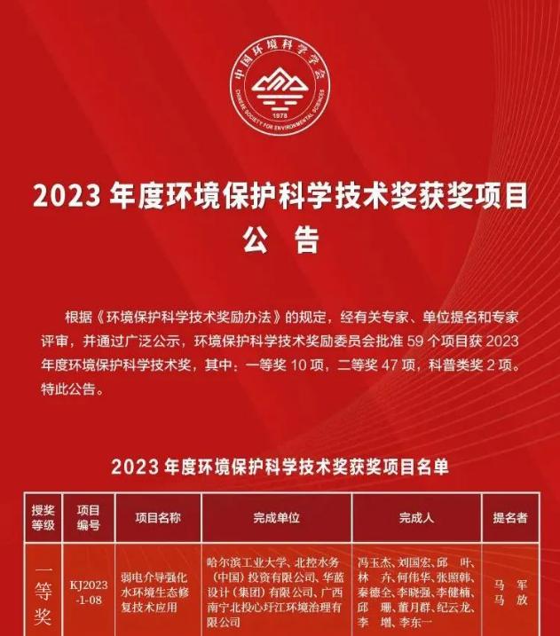 2023年12月25日,中國環境科學學會發布《2023年度環境保護科學技術獎獲獎項目公告》,北控水務參與申報的“弱電介導強化水環境生態修復技術應用”榮獲一等獎。本次共批準59個項目,其中一等獎10項,二等獎47項,科普類獎2項。