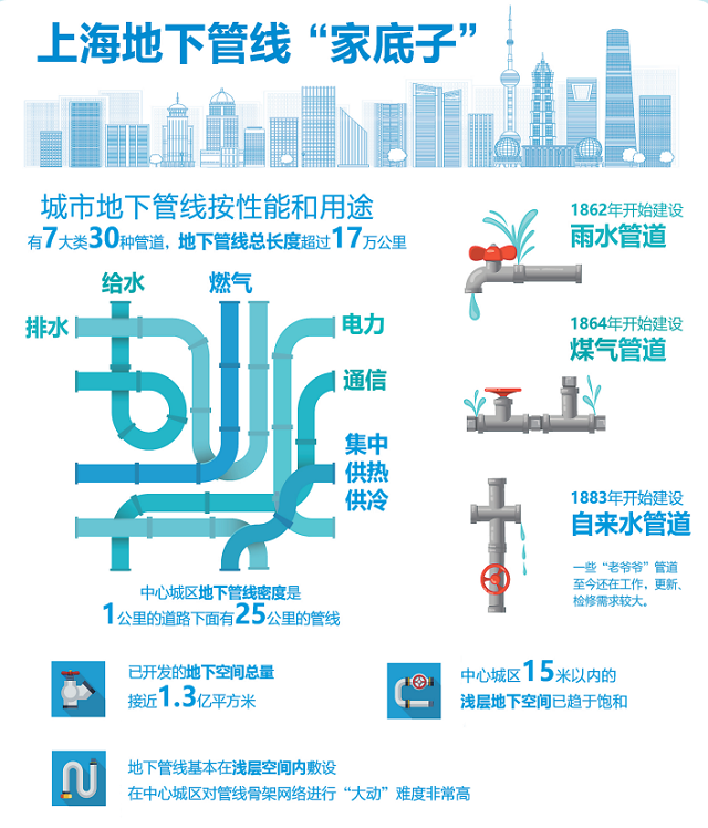 市政管線是城市的生命線。目前上海地下管網(wǎng)按性能和用途已有給水、排水、燃?xì)狻㈦娏Α⑼ㄐ拧⒓泄峁├涞?大類30種管道,地下管線總長度超過17萬公里。總體而言,上海的地下管線建設(shè)和管理一直處于全國領(lǐng)先水平。