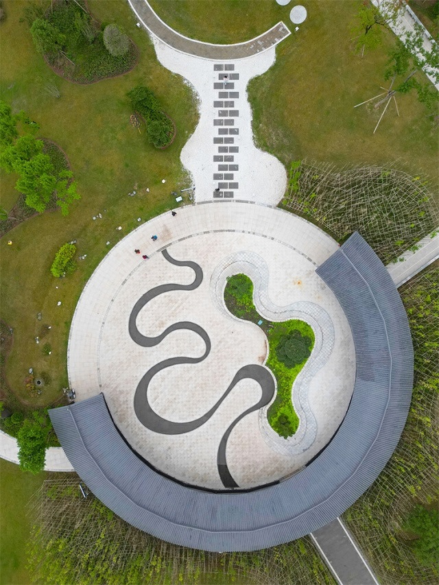 來到文博公園山頂,圓弧形風雨連廊形成一個圈,圈里是“海綿+文化”的巧妙融合而形成的標志性景點——曲水流觴。風雨連廊房頂斜坡的雨水,從屋檐滴落到碎石帶上,經(jīng)過消能、凈化后,匯入蓄水池。