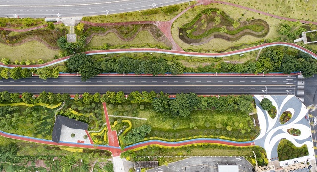 而今,大家口中的“濺水路”,在海綿城市建設中得以“翻新”“走紅”。從無人機視角俯瞰,現(xiàn)在的會展街好似一條“彩虹路”,車輛雙向四車道上通行有序,行人在五彩游步道上觀美景、嗅花香。