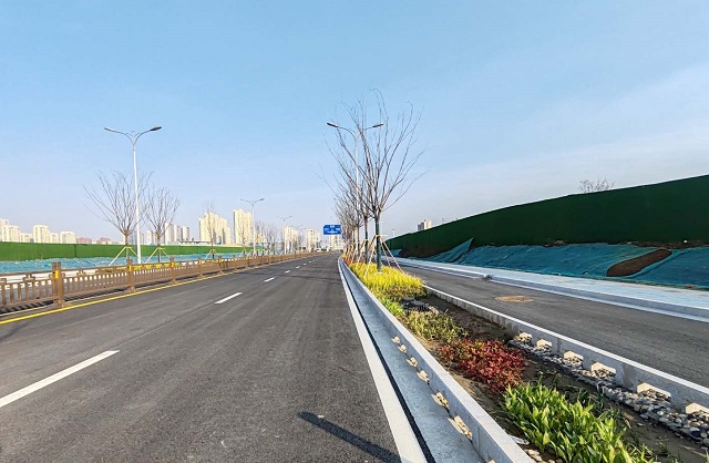 經(jīng)過施工人員的奮戰(zhàn),這一段道路快車道已完成瀝青鋪設(shè)及路面標(biāo)線、路牌等配套工作,目前僅剩下西段慢車道的面層瀝青還沒有鋪設(shè),綠化人員正在進(jìn)行配套綠化施工……整個工程已基本建成,開始進(jìn)入掃尾階段。