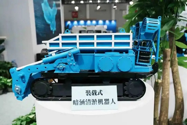 中建三局綠投公司參展的裝載式暗涵清淤機器人已應用于中山小隱涌項目,可適應淤泥板結、生活垃圾,和建筑垃圾混雜等復雜工況,24小時全天候作業,最大清淤效率達18方每小時,相當于20名工人同時作業