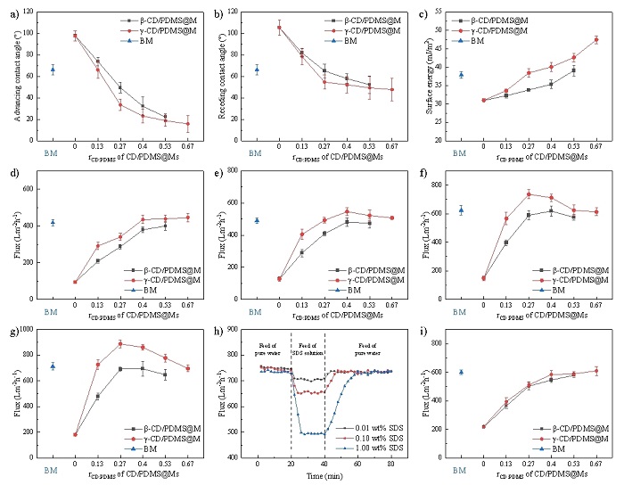針對上述問題,團(tuán)隊提出使用超分子而非高分子在水處理膜表面構(gòu)建抗污染層的策略。超分子為由聚二甲基硅氧烷(PDMS)和環(huán)糊精(CD)組成的聚輪烷。PDMS為低表面能線性大分子,CD是親水環(huán)狀小分子,CD-PDMS聚輪烷呈線穿環(huán)結(jié)構(gòu)。CD可沿PDMS鏈滑動、旋轉(zhuǎn)和振動,形成相對動態(tài)親水-低表面能非均相微區(qū)。這一結(jié)構(gòu)可使污染物與膜表面的接觸不穩(wěn)定,輔以CD的布朗運(yùn)動,能夠在低切向流,甚至靜態(tài)條件下有效驅(qū)除膜表面污染物。此外,還可防止低表面能組分團(tuán)聚,并通過氫鍵作用攜帶并促進(jìn)水分子傳輸。