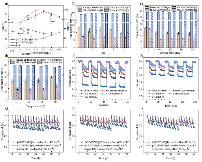 研究成果揭示了CD類型、CD/PDMS摩爾比-CD/PDMS聚輪烷動態(tài)性-膜綜合性能間的級聯(lián)關(guān)系,確定了最佳抗污染層結(jié)構(gòu)。因γ-CD空腔大、柔性強(qiáng),γ-CD/PDMS聚輪烷的動態(tài)性優(yōu)于β-CD/PDMS聚輪烷。當(dāng)CD和PDMS鏈節(jié)數(shù)量比為0.27~0.40時(CD完全覆蓋PDMS時該值為0.67),CD/PDMS聚輪烷動態(tài)性最強(qiáng),此時單個CD動態(tài)性和CD數(shù)量的乘積最大。實驗結(jié)果表明,膜綜合性能在超分子抗污染層動態(tài)性最強(qiáng)時達(dá)到最高值,20℃下滲透通量500 LMH·bar-1,過濾BSA溶液通量衰減率14.2%,恢復(fù)率99.7%,且優(yōu)秀抗污染效果普適于酵母菌、腐植酸、海藻酸鈉、乳化油等多種污染物,在松花江水、市政污水和魯奇爐煤氣化污水等實際水體的72小時錯流實驗中,也表現(xiàn)出了優(yōu)越的穩(wěn)定性,每個反洗周期(4小時)中衰減率僅為3%-7%,化學(xué)清洗后通量恢復(fù)率接近100%。反證實驗表明了超分子動態(tài)性是膜通量提升的關(guān)鍵因素,基于AFM的作用力測定和微量吸附實驗進(jìn)一步證明了超分子動態(tài)性在膜抗污染能力強(qiáng)化方面的多重作用。團(tuán)隊通過實驗和理論的相互驗證,為水處理膜抗污染能力強(qiáng)化提供了更多策略。