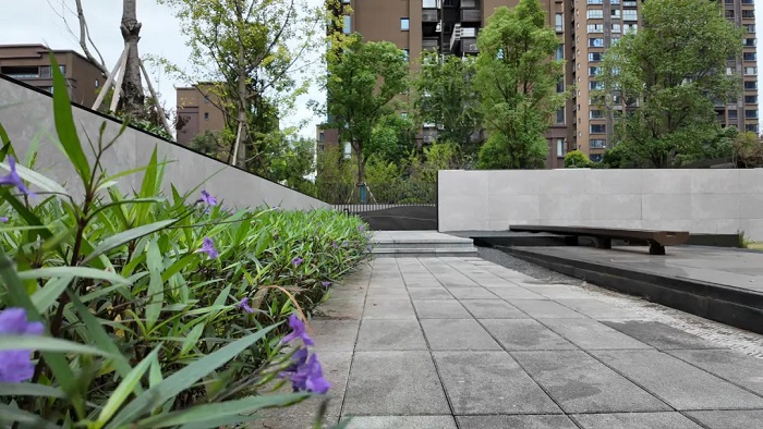 東林道小區(qū)將海綿設(shè)施功能與景觀環(huán)境融合,依托雨水花園打造了充滿自然野趣的景觀小品,雨水花園和透水鋪裝分布在小區(qū)內(nèi),雨水不會(huì)直接從步道流向管渠,而是先進(jìn)入雨水花園或透水鋪裝滯留和滲透,多余的雨水可流入市政管網(wǎng)或調(diào)蓄池,可用于物業(yè)灌溉等。如此一來,既保證了路面干爽潔凈,又讓水資源得到了循環(huán)利用。