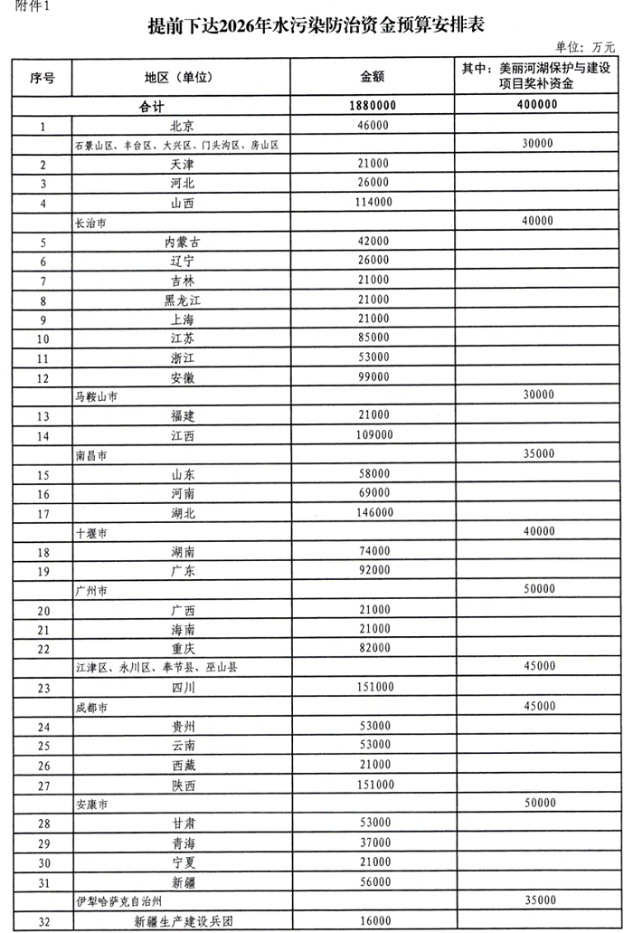 附件:提前下達2026年水污染防治資金預算安排表